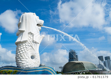シンガポール 青空に映えるマーライオン像と高層ビル群