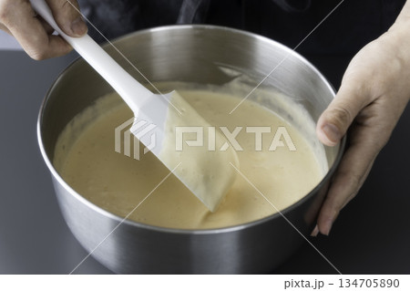 ゴムベラでケーキ生地を混ぜる手元 ステンレスボウルのクローズアップ