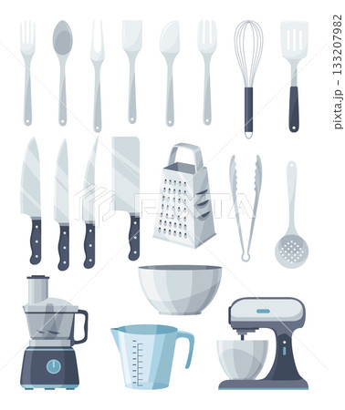 Kitchen tools array, Coherent setup of cooking tools and equipment on countertop, Neatly arranged assortment of kitchen utensils and appliances for culinary activities
