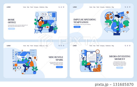 Set of vector illustrations depicting home office, impulse spending, side hustle, and micro-investing. Individuals are engaged in various financial and creative activities, showcasing planning and