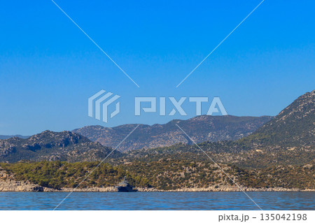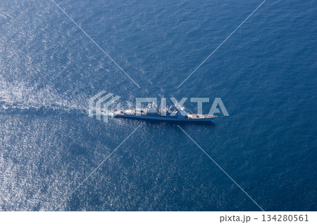 Turkish navy warship sailing in the Mediterranean sea. Protection of water borders of Turkey