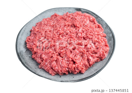 Fresh raw ground mince pork and beef meat on gray plate over white background showing detailed minced texture ideal for cooking, butcher and protein visuals.