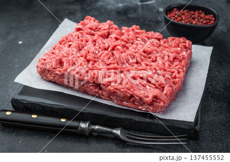 Ground mince beef or veal on parchment over dark concrete background offering detailed texture perfect for grocery, cooking and nutrition imagery.