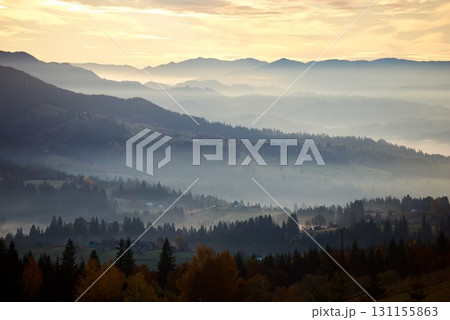 Misty autumn morning in mountain valley. Layers of hills bathed in soft light, with patches of sunlight breaking through fog, illuminating autumn foliage. Interplay of light and shadow.