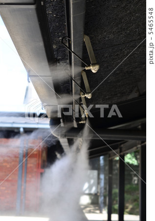 夏のイベント会場の建物のミストシャワーのアップの風景