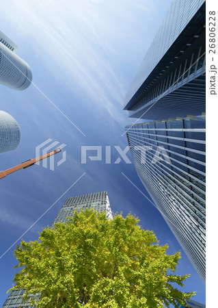 名古屋中区 都市風景 桜通の銀杏並木と名古屋駅ビル群