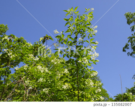 青空に映えるミツバウツギの白い花