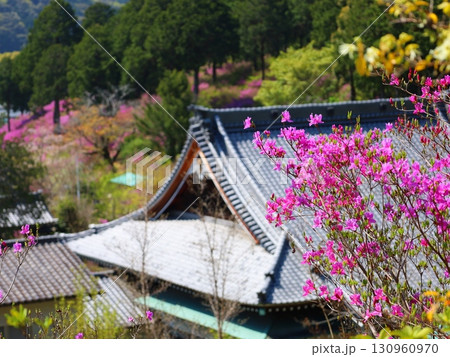 ミツバツツジが咲き乱れ山がピンク色に染まった春色の木津川市神童寺境内を撮影