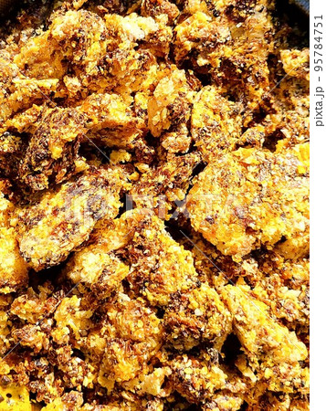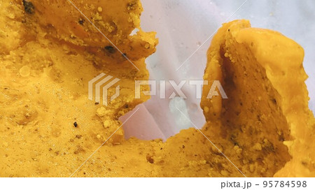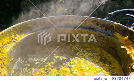 ミツロウブロックの生成 巣蜜の搾りかすを熱水に溶かし込む