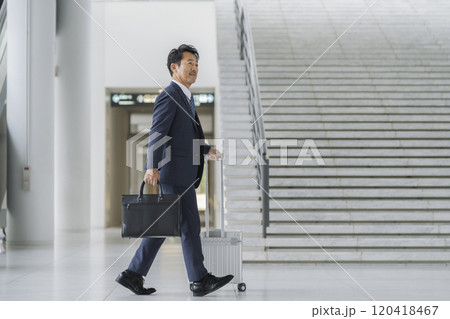 キャリーバッグを持って歩く50代のビジネスマン 出張イメージ