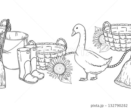 Hand drawn seamless ink line art border of rustic barn interior with goose, bucket, boots, broom, sunflower. Vintage countryside farm atmosphere for packaging, textile, wrapping, educational projects.