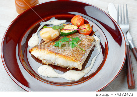 真鯛と帆立のポワレ、ホワイトソース添え。ズッキーニとミニトマトのソテー添え。