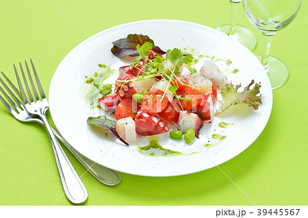 バジル(ハーブ)とトマト、タコとホタテのサラダ・カルパッチョ。イタリアン、シーフードサラダ。