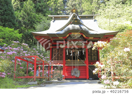花園神社の拝殿とシャクナゲの花 北茨城市