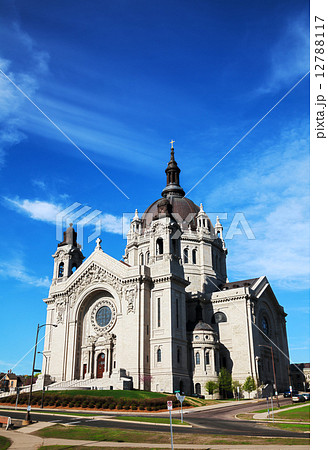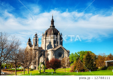 Cathedral of Saint Paul stands in Minnesota, USA. Historic Classical Renaissance architecture features the massive copper dome and stone facade on Cathedral Hill