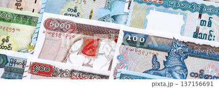 Myanmar kyat paper banknotes pile on table. Myanmar MMK currency money bills in big amount. Concept of economics, taxation and banking in Myanmar
