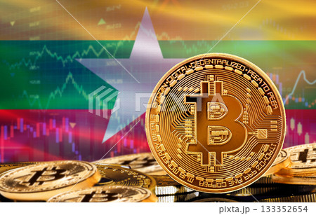 Investors in cryptocurrency and Blockchain Technology in Myanmar, Concept. Bitcoin with Myanmar flag in the background