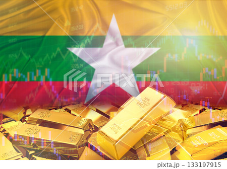 Gold bars on Myanmar flag in background. Gold bars stacked on Burmese flag. Concept of Myanmar gold reserves