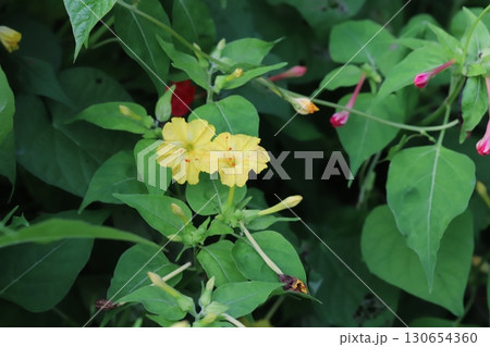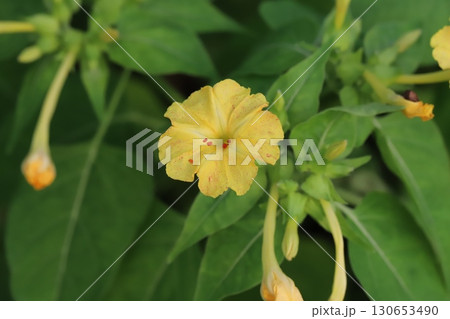 夏の庭に咲く黄色いオシロイバナの花