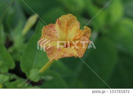 夏の庭に咲く黄色い花びらにピンク色の斑点模様があるオシロイバナ