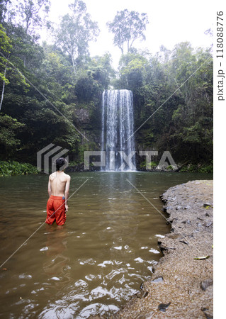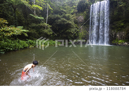 森の中にある滝で泳ぐ子ども