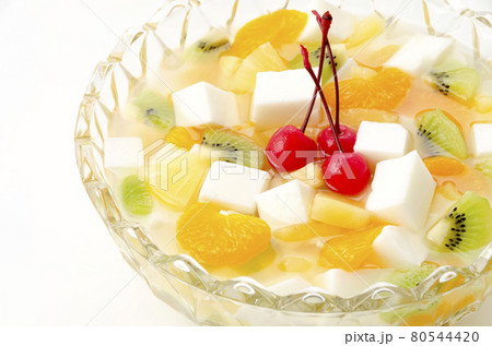 牛乳かんやパイン、マンゴー、白桃、チェリー、ミカン等のフルーツが入ったフルーツポンチを白背景で撮影