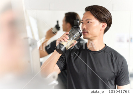 ドリンクを飲むスポーツウェア着用の男性