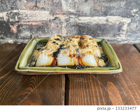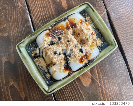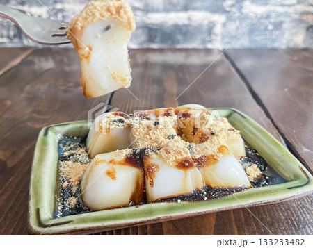 こんにゃく粉で作った甘いミルク餅。黒蜜ときなこをトッピング。