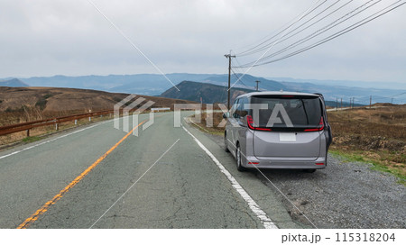 Van car on Aso Milk Road curve downhill road, Kumamoto