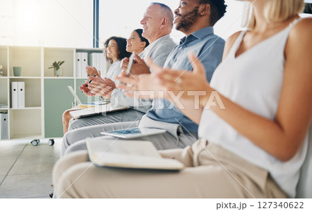 Business, conference and applause from group of people happy at workshop or kpi target presentation for startup growth. Hands clapping, men and women in audience at tradeshow clap in celebration.