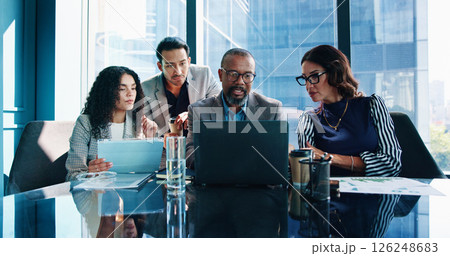 Laptop, team and business people planning in meeting or brainstorming idea with investment data. Group, computer or corporate discussion with risk manager for analysis or financial proposal in office