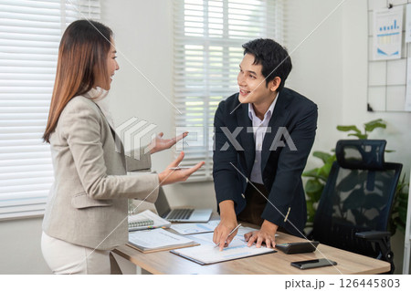 Business man and Business woman talking and brainstorming, discussion with colleague about project