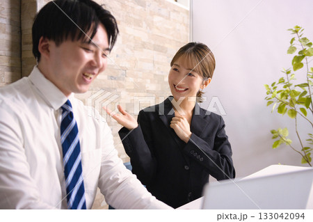 オフィスでパソコンを見ながら打ち合わせをする若い男女