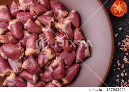 Raw fresh chicken or turkey liver, internal offal of poultry. Raw chicken liver