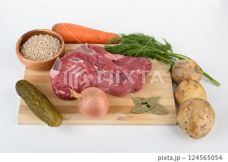 Raw meat on a cutting board and ingredients for making soup - Leningrad rassolnik.