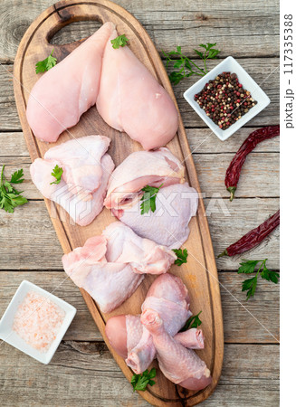 Raw mixed chicken meat parts for cooking on rustic background