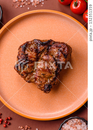 Pork breast steak, grilled fillet, healthy food, lunch. Pork steak as food background