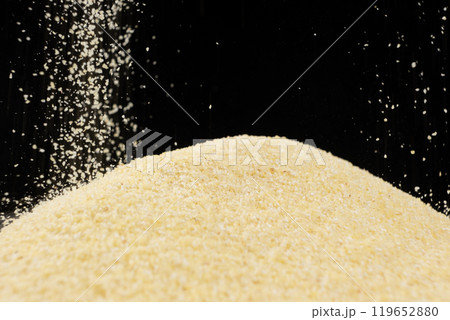 Hands pouring dry semolina durum flour uncooked organic semolina close-up gray background