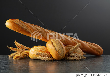Bakery - various kinds of breadstuff. Bread rolls, baguette, bagel, sweet bun and croissant captured from above (top view, flat lay). wooden rustic background, copy space. Horizontal banner layout.