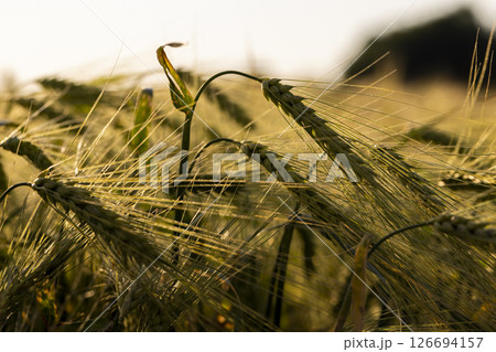 Ripe wheat field at sunset. Nature's harvest growth. Beautiful summer nature background.
