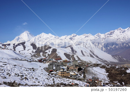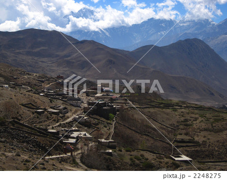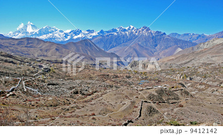 ネパール ムクティナートの町並みとダウラギリ