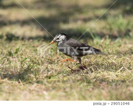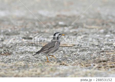 ムクドリ 立ち止まって地面の上の食べ物を探している