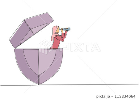 Single continuous line drawing Arab businesswoman emerges from shield look for something with binoculars. Combining knowledge and experience for data protection. One line design vector illustration