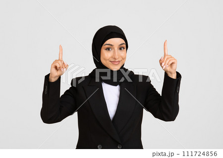 A portrait of a successful Asian Muslim businesswoman stands in her modern office