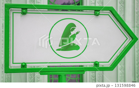 A sign indicating the place of prayer and depicting a Muslim woman, against the backdrop of a mosque wall