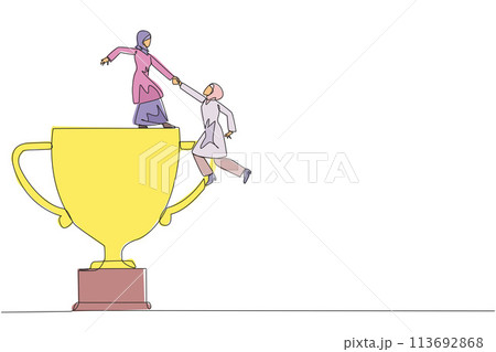 Single one line drawing Arabian businesswoman helps colleague climb big trophy. Achievement that cannot be achieved without great teamwork. Smart teamwork. Continuous line design graphic illustration