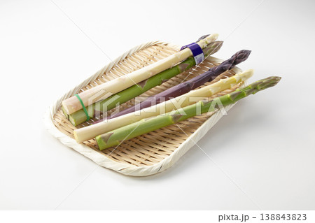ザルに盛られたホワイトアスパラガスと紫アスパラガスセット