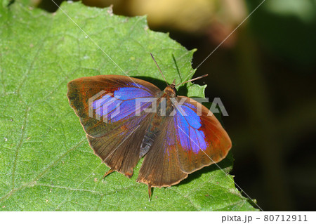 生き物 昆虫 ムラサキツバメ、メスです。前翅中央に美しい瑠璃色。天敵を遠ざける効果がある?