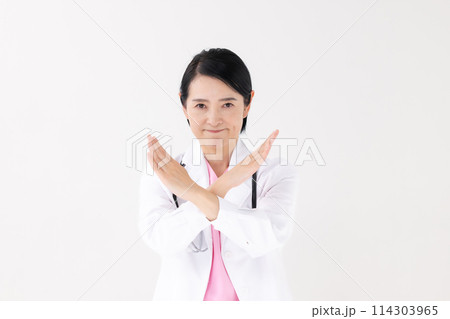 両手でバツをつくりダメ出しするピンク色のニットを着た中年女性