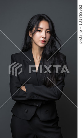 Confident Asian woman in black suit, showcasing style and professionalism in minimalist studio setting with neutral background